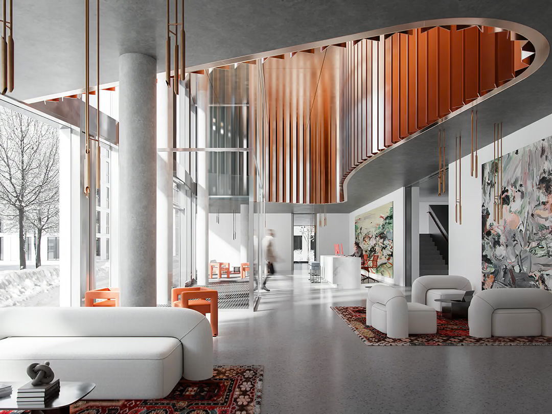 The transparent glass-aluminum façade with its wall-high window surfaces is defined and structured by vertical pilaster strips and horizontal cornice bands – a filigree network that runs across the entire volume of the building. The prefabricated façade modules are placed in front of the structure. Due to the curved design, the façade grid deviates from the construction grid – a particular challenge As in the entire building, transparency also plays a decisive role in the lobby of the MAXXHeim, which features public areas, social areas, meeting zones as well as communication and meeting spaces. The flexible floor plans meet the requirements of New Work and hybrid working models and can be largely customized. As the main tenant, the ICS Group will use a large part of the office space itself. As this was already clear at the start of the project – the ICS Group is the initiator of MAXXHeim via the project company Eastsite Real Estate GmbH & Co. KG – its specific requirements could already be taken into account during the planning stage. As a leading provider of innovative IT and logistics solutions, ensuring an optimal, redundant digital infrastructure and connectivity is particularly important for the company in addition to the flexible spatial layout. for the designers. Access is from the inside, so that the office areas grouped around the building core benefit from the transparency of the façade without restriction.