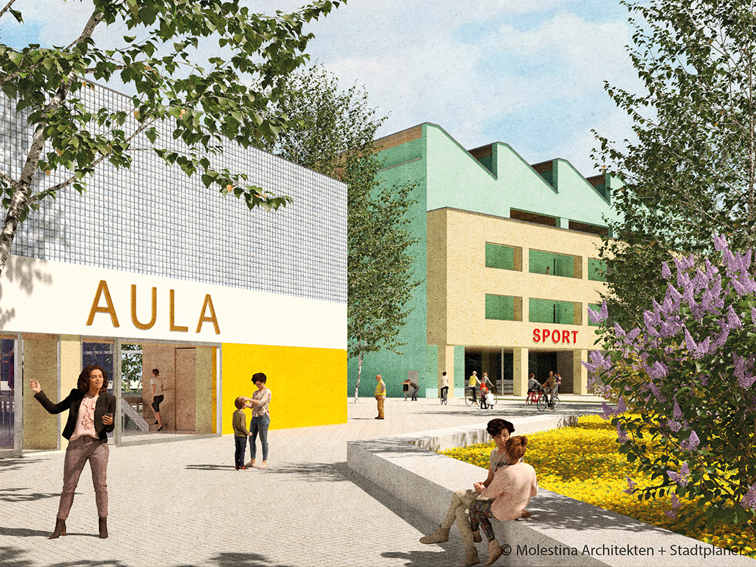Molestina Architekten setzten das pädagogische Konzept konsequent in eine modulare Architektur um. Mittelpunkt des Grundmoduls, das je nach Funktion variiert, ist der Cluster als integrativer Raum mit Lichthof. Das Gebäudeensemble besteht aus vier viergeschossigen Lernhäusern, die durch ein gemeinsames oberstes Geschoss verbunden sind. Ergänzt werden sie durch eine als Solitär geplante Zwei- und Dreifachsporthalle mit Tiefgarage. Aula und Mensa im „Eventhaus“, moderne Lerncluster für die Sekundarstufen I und II sowie naturwissenschaftliche und kreative Fachräume schaffen eine zukunftsfähige Bildungsumgebung. Innenhöfe, offene Freiräume und begrünte Fassaden sorgen für eine enge Verbindung von Innen- und Außenraum.